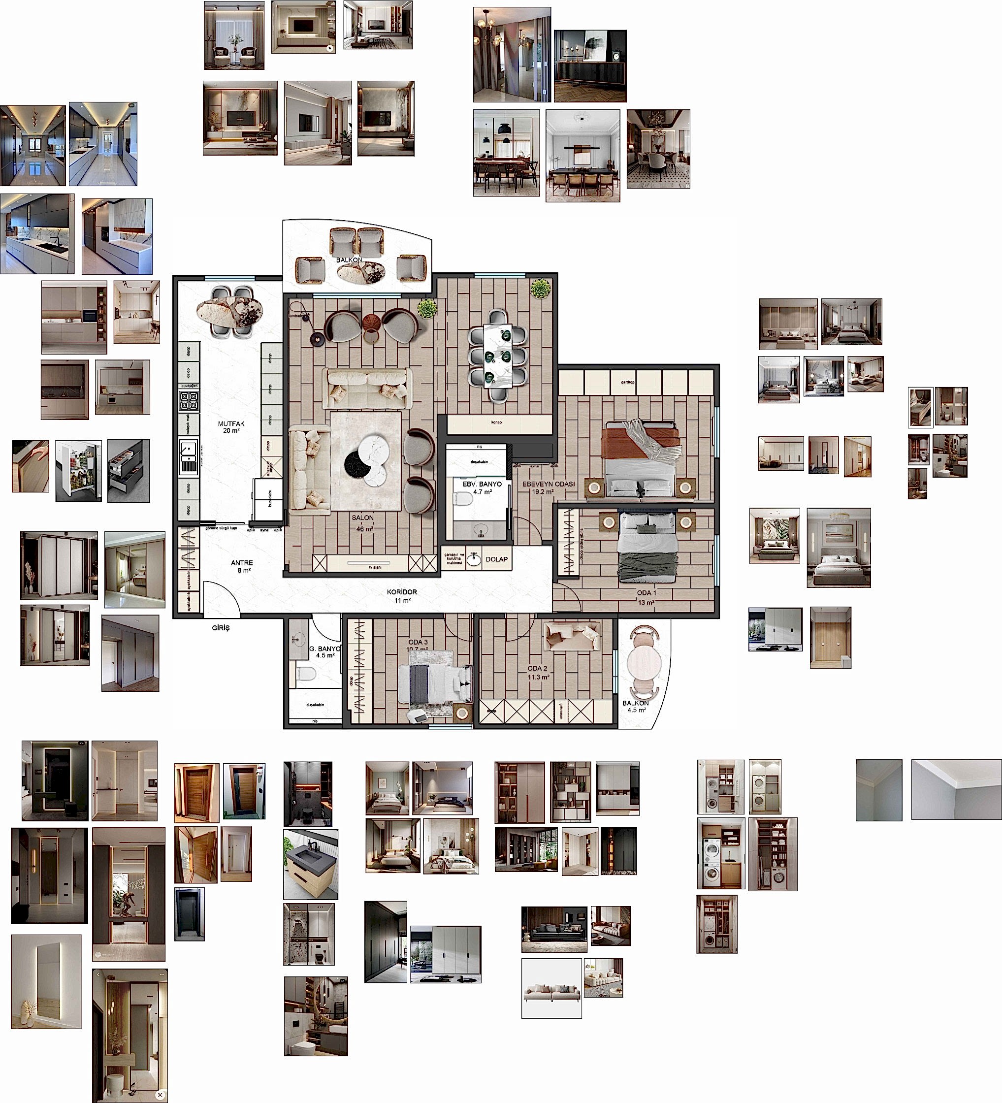 İç mimari hizmetlerimizde sadece estetik kaygıları değil, aynı zamanda mekânların kullanım ihtiyaçlarını da gözetiyoruz. TV alanı, oturma ve yemek bölümleri gibi fonksiyonel alanların tasarımında dengeli yerleşim planları oluşturuyoruz. Ekstra olarak okuma köşeleri, şömine alanları ve depolama çözümleri ile mekânlara kişiselleştirilmiş dokunuşlar katıyoruz.