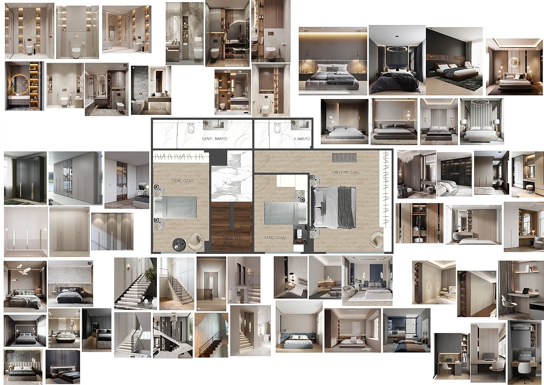 Koridorlar ve geçiş alanları da iç mimari tasarımlarımızın önemli bir parçasıdır. Bu alanlarda işlevselliği artıran depolama çözümleri ve aydınlatma unsurları ile şık ve düzenli bir atmosfer oluşturuyoruz. Mekânın genel dekorasyonuyla uyumlu malzeme ve renk seçimleri sayesinde koridorları yalnızca geçiş alanı olmaktan çıkarıp, dekorasyonun bir parçası haline getiriyoruz.